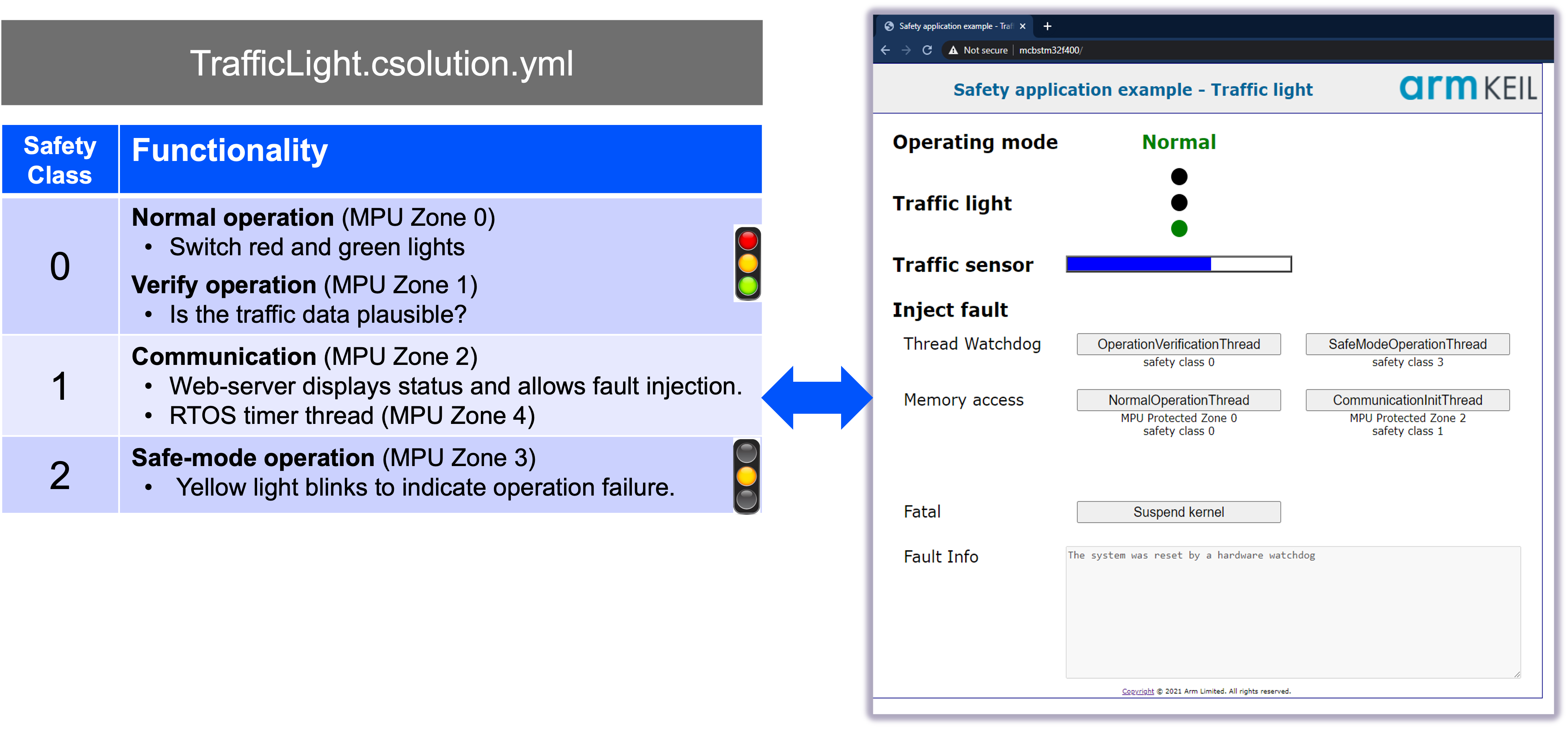 The Safety-Example-STM32 repository demonstrates functional safety concepts on STMicroelectronics devices using Keil Studio. It uses the MPU of the Cortex-M33 (Arm-v8M architecture). The TrafficLight.csolution showcases FuSa RTS process isolation features including safety classes, MPU protected zones, and fault handling in a practical traffic light controller scenario. These examples use the open-source Keil RTX for evaluation purposes with the MDK-Community edition, providing similar functionality to the commercial FuSa RTS. The repository demonstrates integration with the CMSIS-Toolbox and CI workflows, including GitHub Actions for automated builds and hardware-in-the-loop testing on a NUCLEO-H563ZI board.