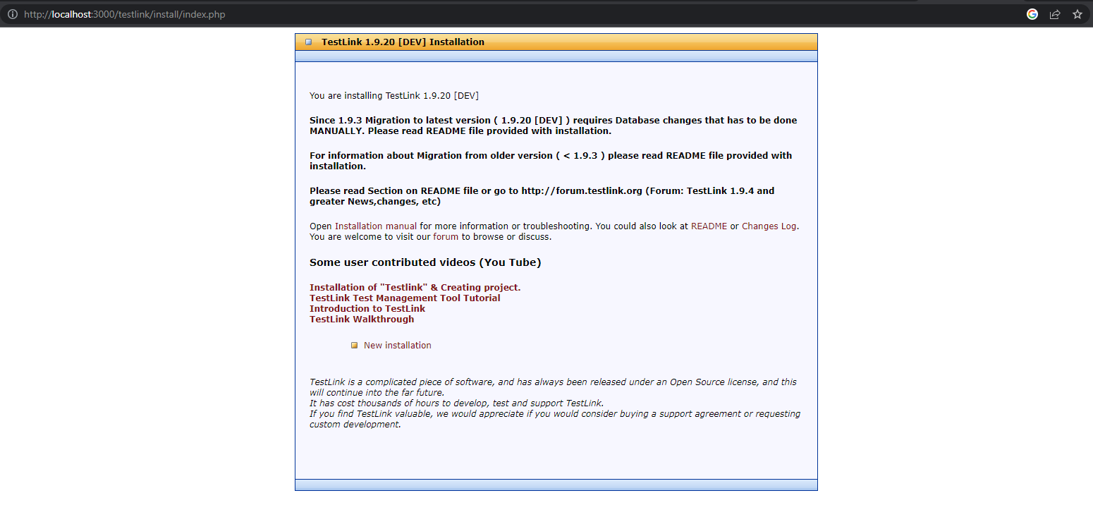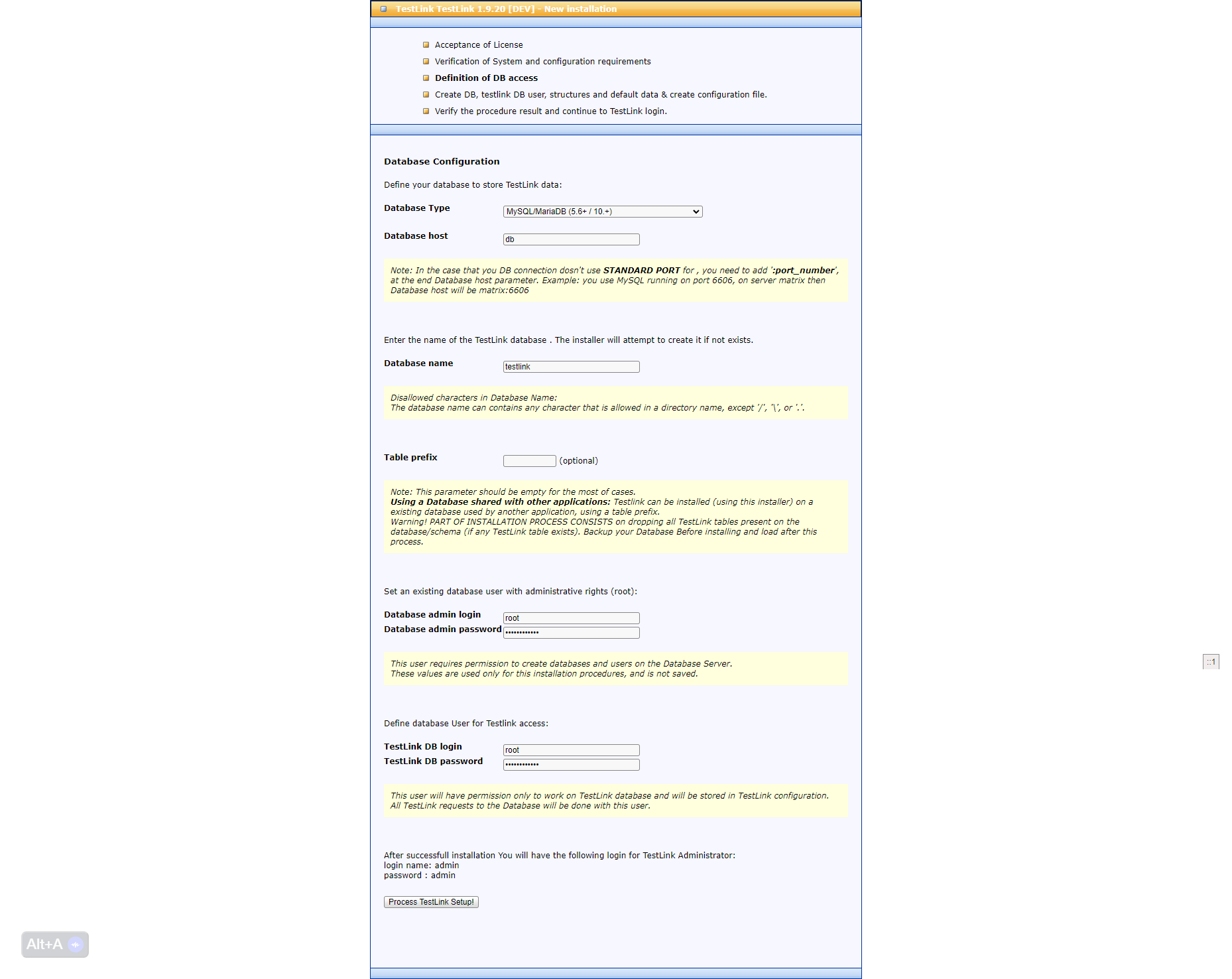 docker-compose up -dTestlink has the web based installer. Run the docker container and access to localhost:3000/testlink endpoint in the web browser. Use user root and MYSQL_ROOT_PASSWORD from doceker-compose.yml, the Database host is db as the name of container defined in a file.