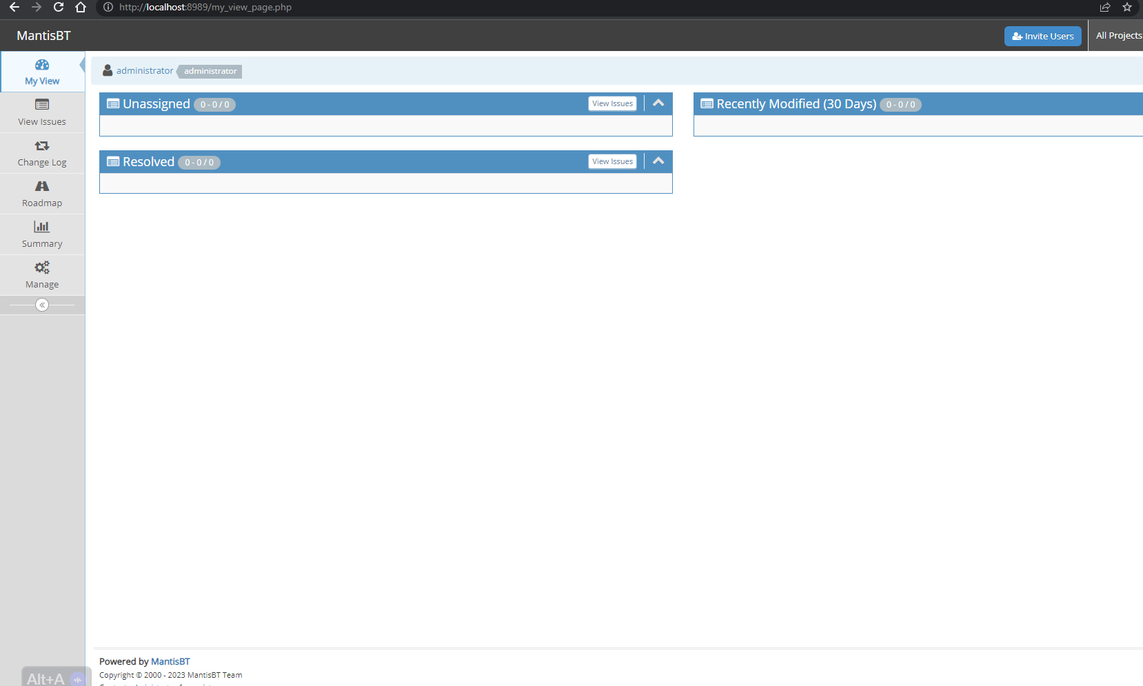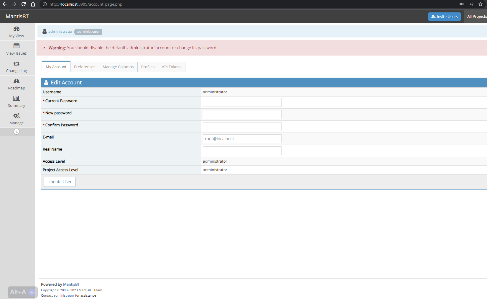 administrator/root. You can then adjust the settings according to your needs, typically, you'd create a new admin account and deactivate the built-in "administrator" account. - Ensure to evaluate the MantisBT's internal checks located at