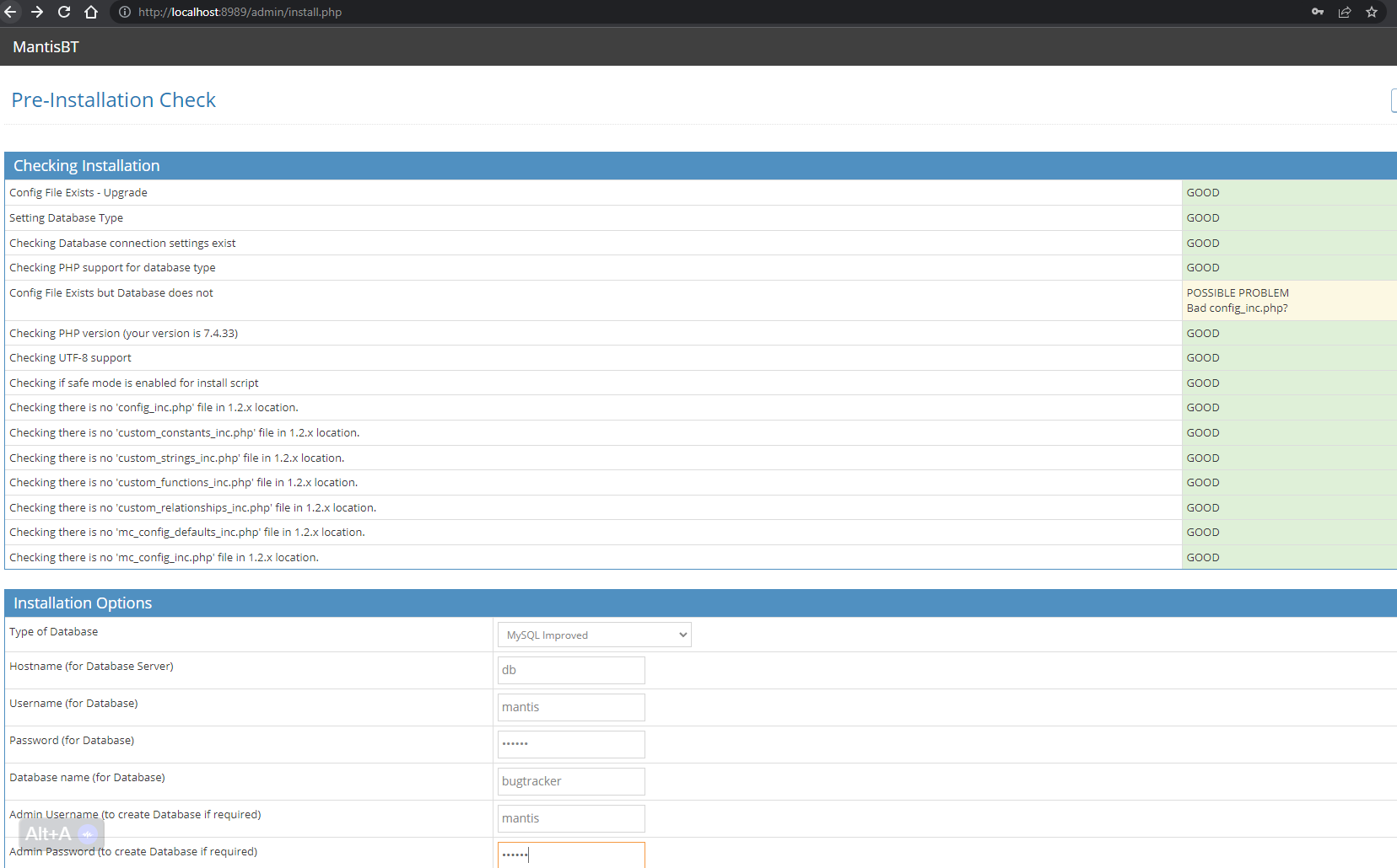 localhost:8989/admin/install.phpin your browser and follow the installation guide. The default settings should be appropriate for most setups. Faster solution is to setup user to mantis with password mantis. - During installation, you may encounter a warning labeled Config File Exists but Database does not. This can be overlooked as you continue with the installation.