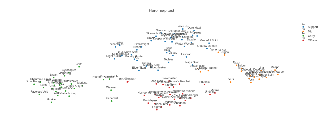[40, 41, 52, 68])For the first query, a simple result is shown (e.g. Radiant has 53.42% chance to win). The second query has a more complex output: tuples of (hero, (win chance, similarity inside team)). We define similarity a score that represents how close two different are role-wise. We use this metric in order to filter out heroes that do not match a team composition (e.g. you do not want a 5 carry team even if they have very high winrates separately). The similarities can be analyzed in a hero map in the next section.