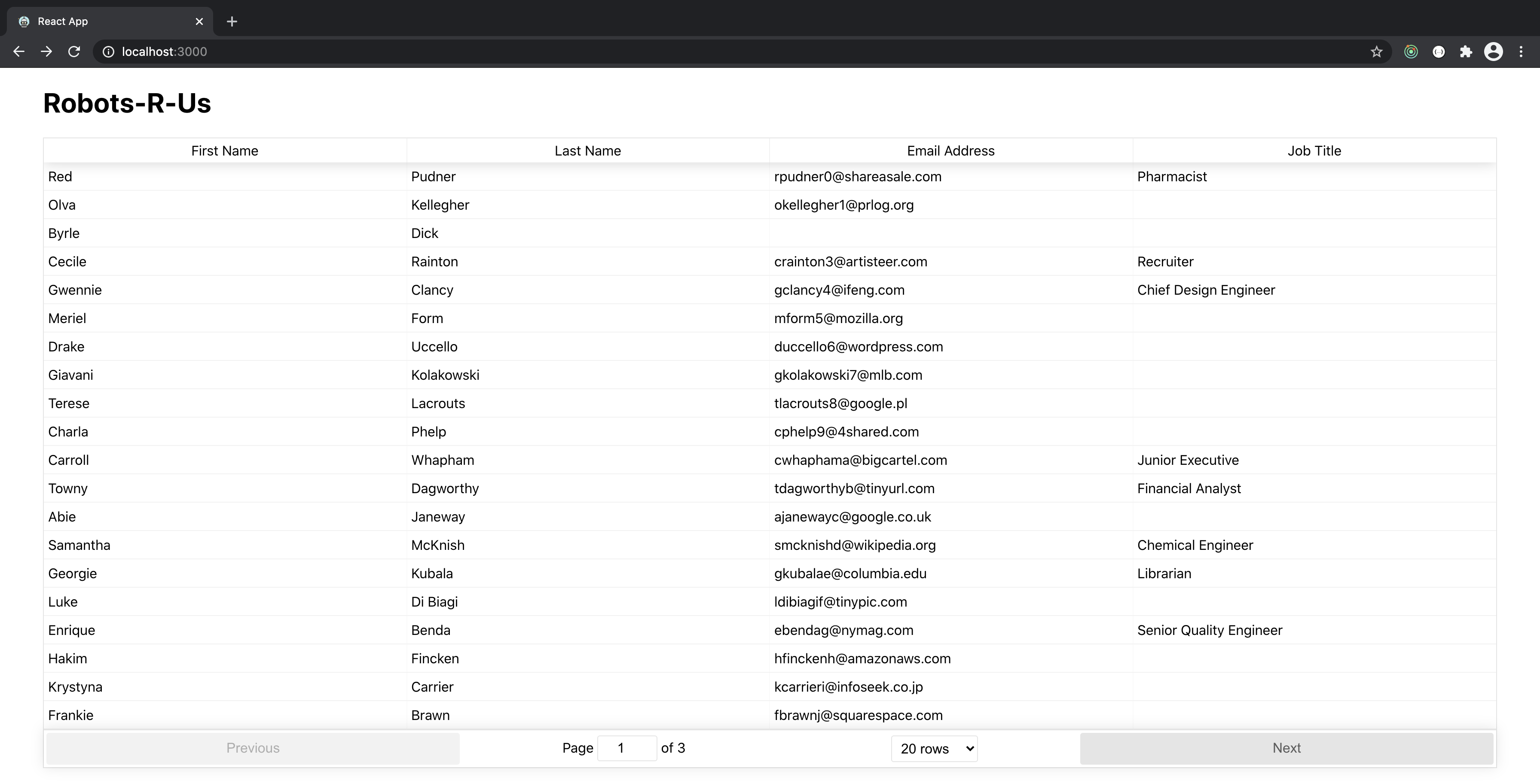 You've just been hired at Robots-R-Us. Your first task is to finish an employee directory using React with a backend API written in Rails. Example data is provided, and the designer gave you this spec to work off:
