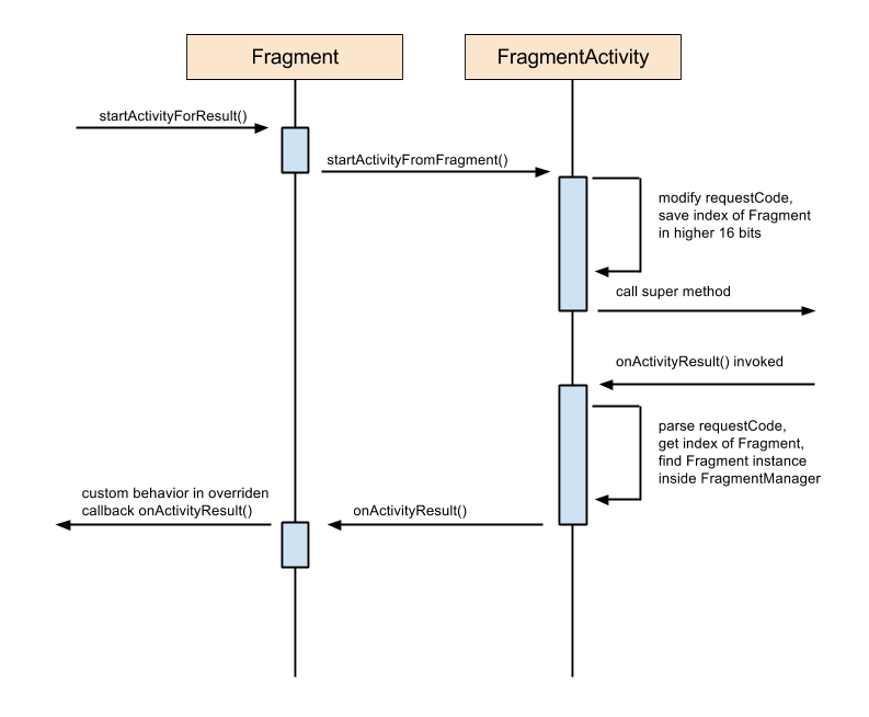 FragmentActivity replace requestCode by modified one. After that, when onActivityResult() will be invoked, FragmentActivity parse higher 16 bits and restore index of original Fragment. Look at this scheme: