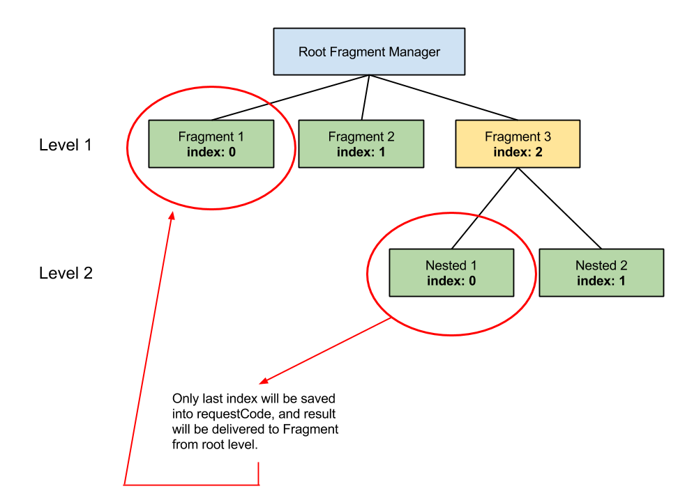 Because only one index is stored inside requestCode. That is index of Fragment inside it's FragmentManager. When we using nested fragments, there are child FragmentManager, which has own list of Fragments. So, it's necessary to save whole chain of indices, starting from root FragmentManager.