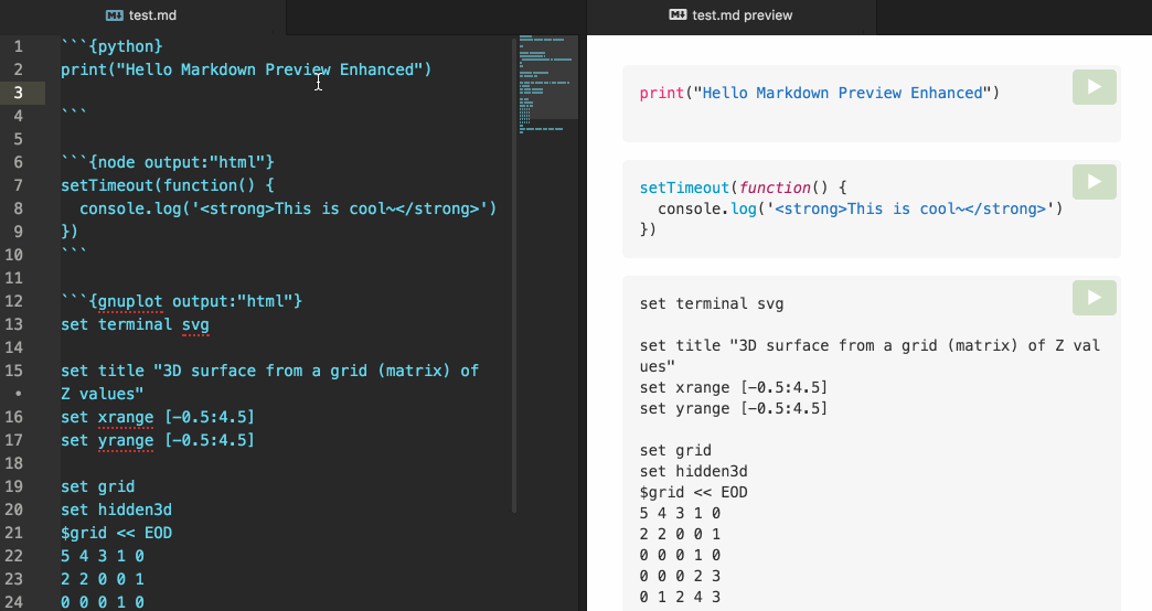 By using Code Chunks (beta), you can run gnuplot, python, nodejs and all other programs in your markdown file.