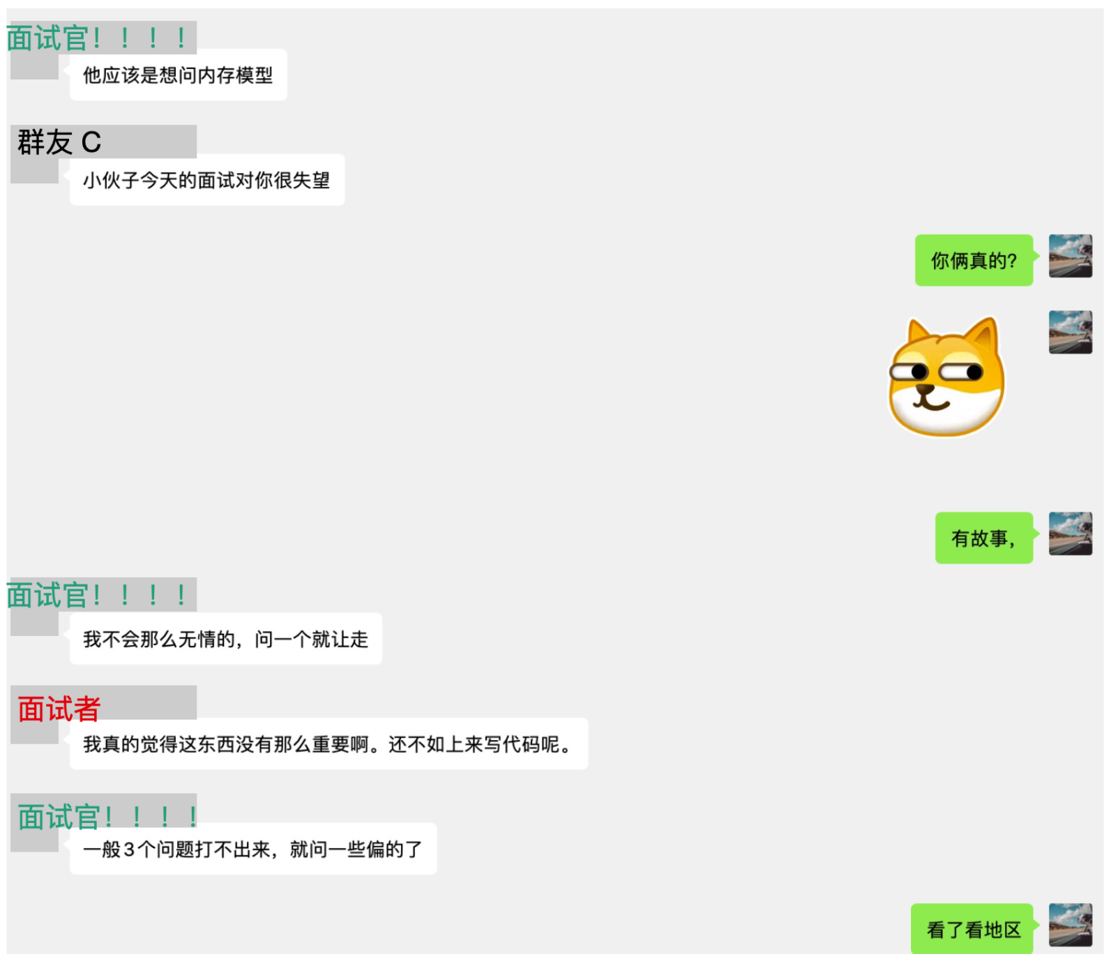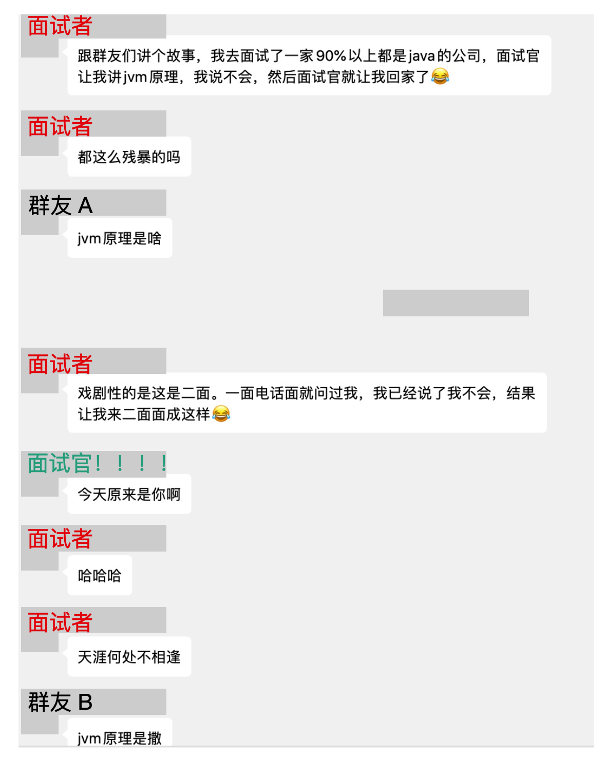 面试官猜到了面试者要问什么,估计是今天面试过的,否则应该猜不到想问什么,毕竟问 JVM,大了去了。然后群友开始了一波 调侃 哈哈哈。