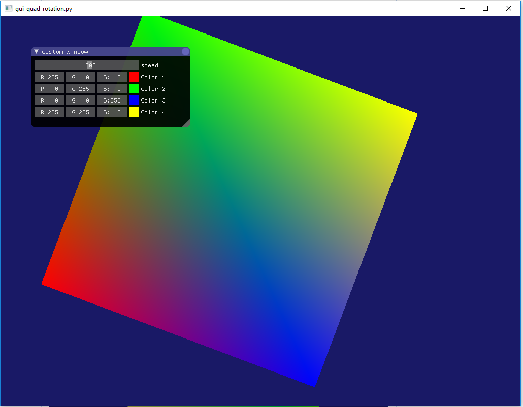@dan90210 You have made good progress. We now must validate that your graphic cards and opengl version supports the required features. In the file glumpy/app/window/backends/backend_pyimgui.py at lines 149+ we have: This means that you drivers, and graphic card, that support opengl 3.2 or better, and that your graphic card must also support OPENGL_COMPAT_PROFILE extension. @rougier A possible way to avoid the requirement for OPENGL_COMPAT_PROFILE would be to integrate imgui (https://github.com/ocornut/imgui) into the glumpy GLFW backend, or even better, for all backends. Immediate mode GUI (like imgui) are very good for tools since they let the code mix more freely with the UI (Unity3D game engine editor is based on an immediate mode GUI interface) and are much lighter than using full GUI framework like Qt. Having all glumpy examples with interactive sliders by requiring just a few lines of extra code in each one of them would be great. The code of examples/pyimgui/gui-quad-rotation.py gives an example of the potential. A quick webgl in-browser example of imgui in action is available here: https://pbrfrat.com/post/imgui_in_browser.html |