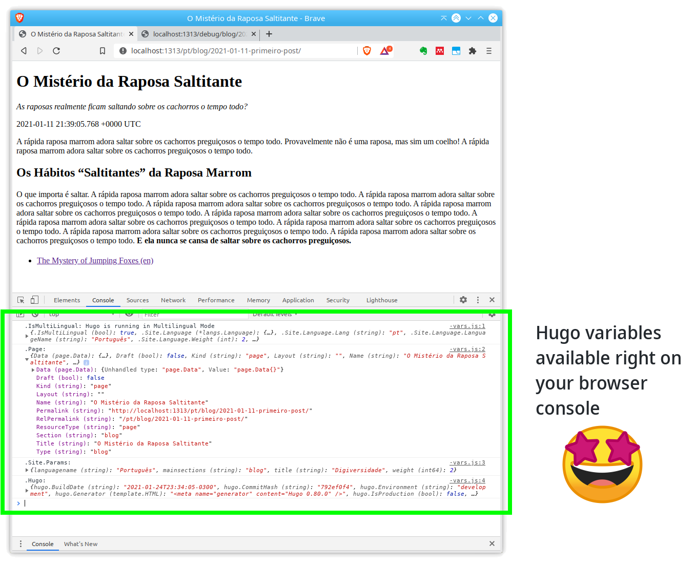 I created this plugin inspired by debug.Dump (yes, such thing exists!) and Kaushal Modi's hugo-debugprint. I needed something that could be contextual (i.e. be available right alongside the page I'm looking at) and also capable of preserving the page output. Because if I'm debugging it, for sure it's already broken some way and I don't want to dabble with extra stuff.