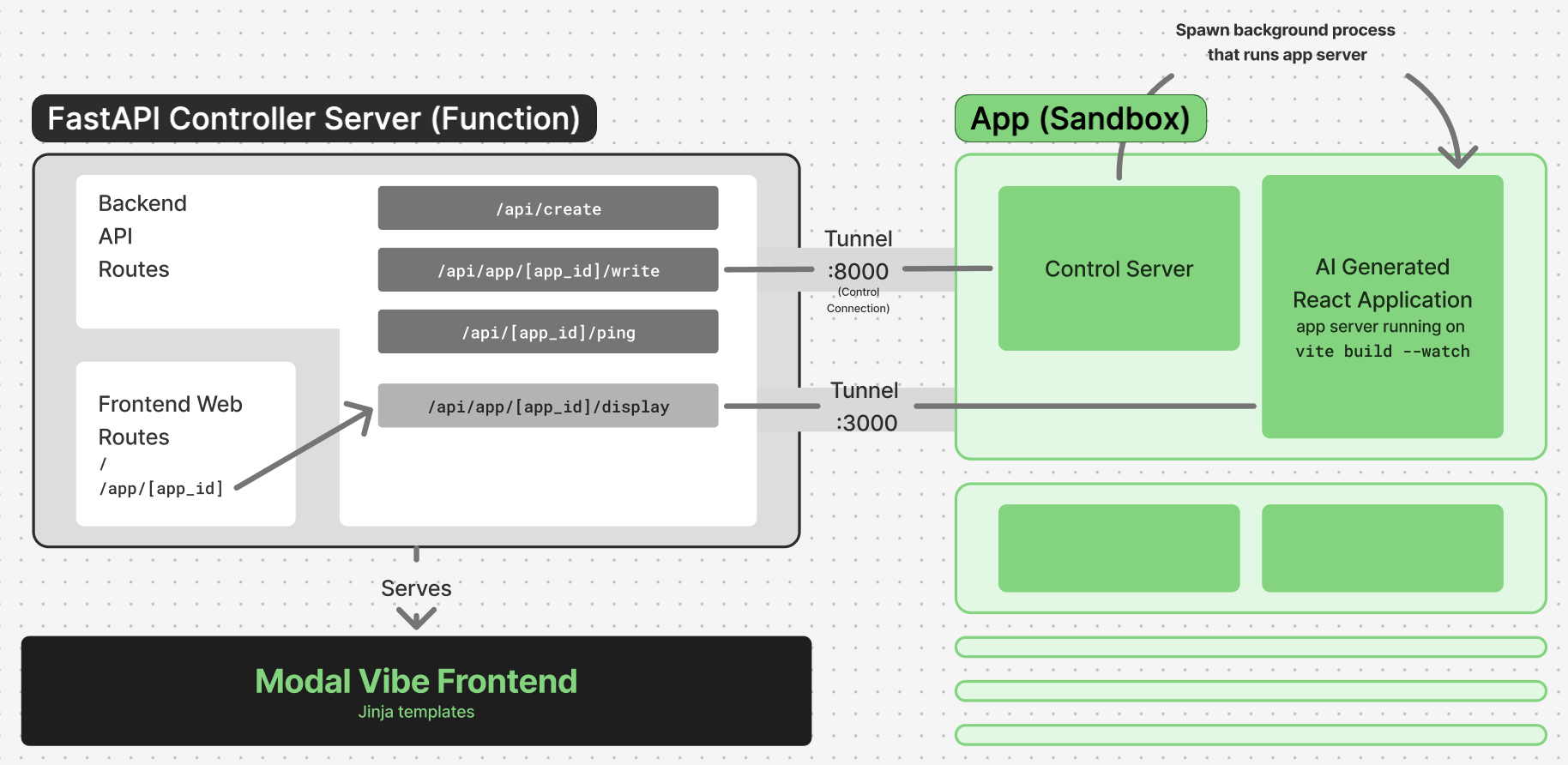 Each application lives on a Modal Sandbox and contains a webserver accessible through Modal Tunnels.