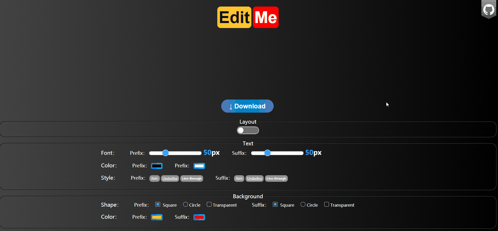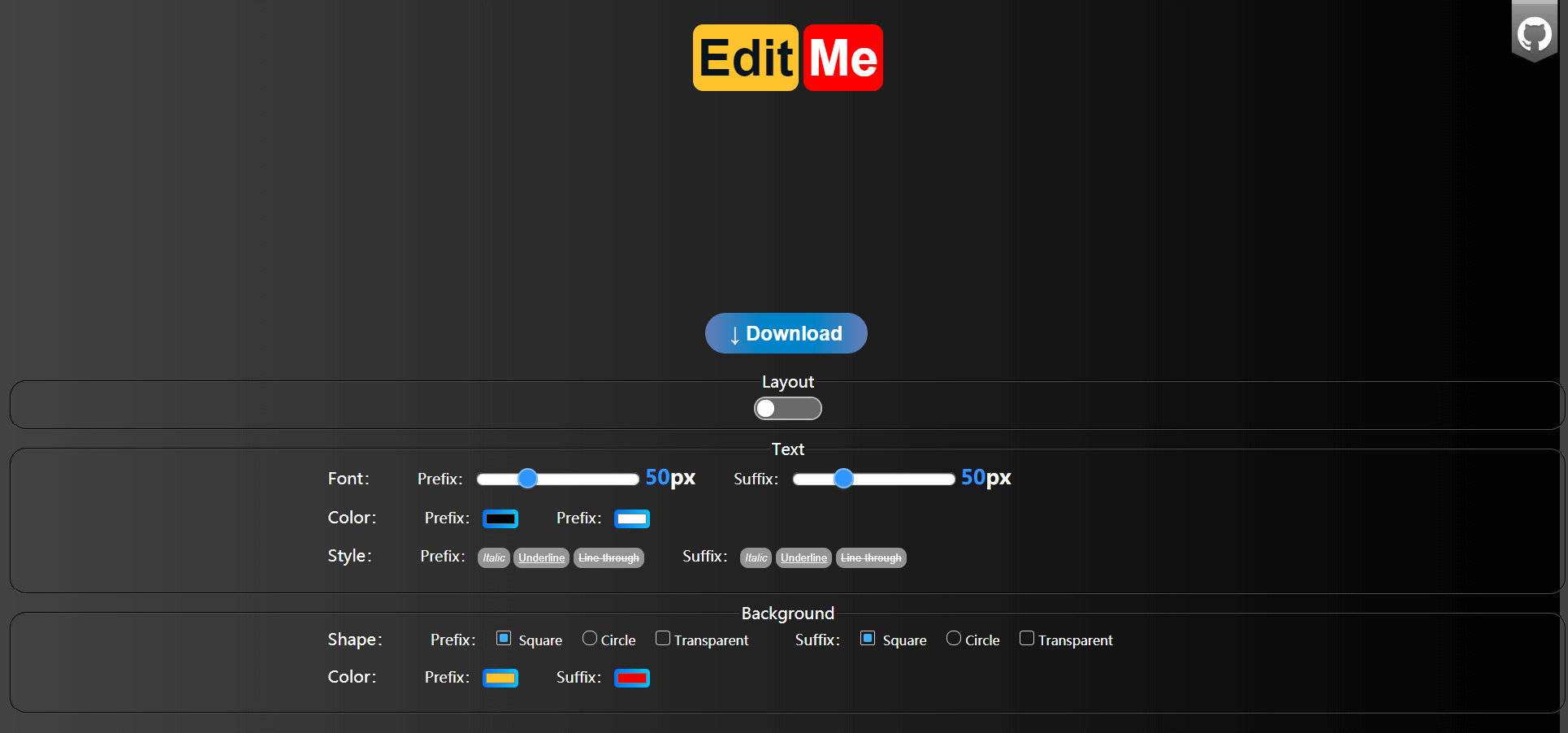 建议使用谷歌浏览器访问 中文文档 | English Document LogoDiy - 一个简单的在线Logo制作工具。 下面是网站的主页截图。 网站主要结构如下: 图片编辑区 - 可以自定义logo文字,编辑好了可以点击Download按钮,生成logo图片。 布局切换 - 可以点击Layout滑块,切换水平或者垂直方向。 文本编辑区 - 可以定义文字大小、颜色及样式。 背景编辑区 - 可以定义背景的形状(方形、圆形、透明)和颜色。 最后,如果对你有点帮助,给个Star呗!😜