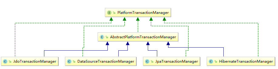 其中Spring JDBC和MyBatis使用DataSourceTransactionManager进行事务管理,图中其它的根据名字Jdo,Jpa,Hibernate就可知道分别是为谁提供的。